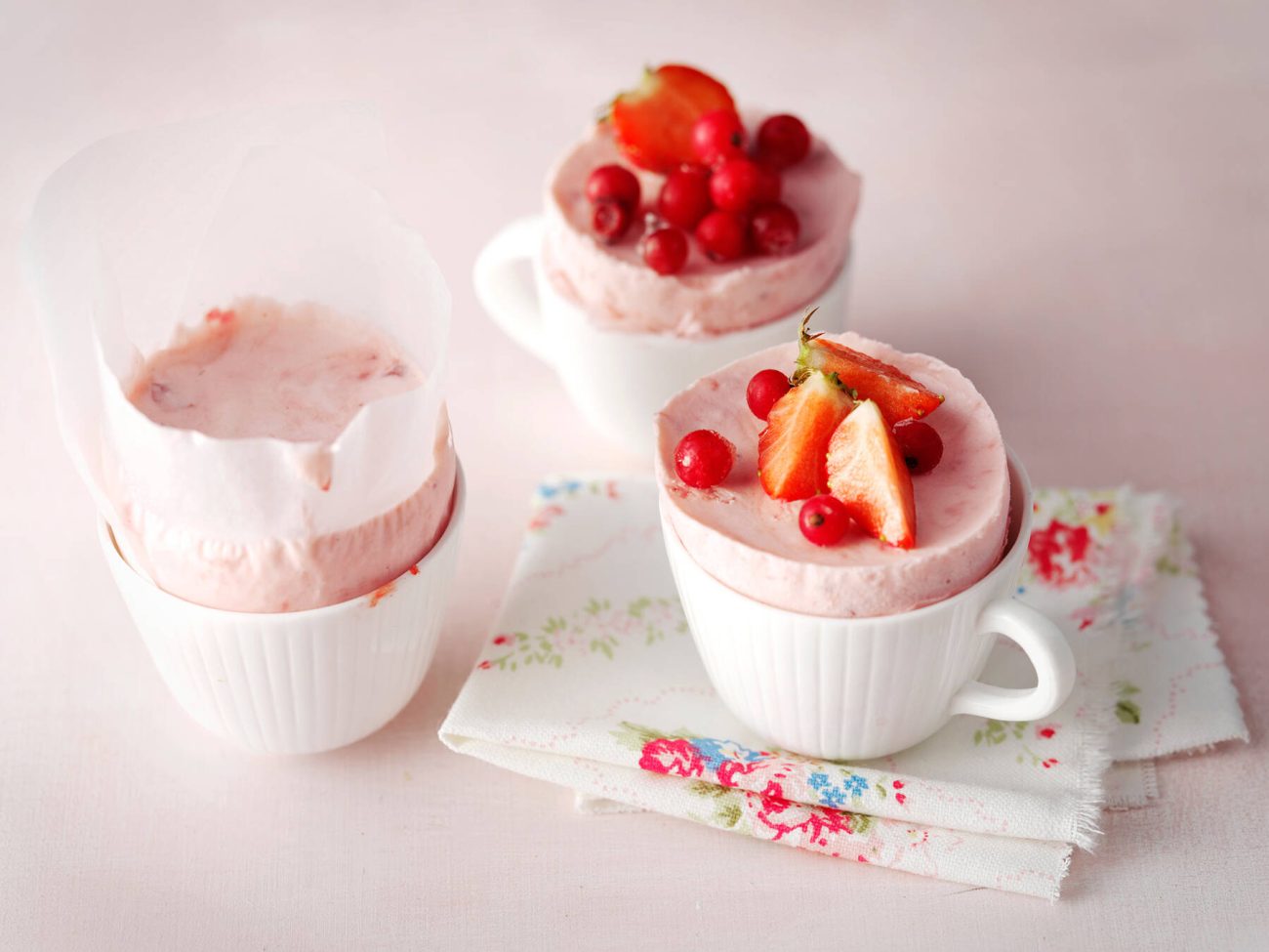 - Kaada seos vedellä huuhdeltuihin annosvuokiin tai 1 l:n jäädyke- tai kakkuvuokaan. Peitä foliolla ja pakasta yli yön. Nosta annosjäädykkeet jääkaappiin n. 30 min ja isompi jäädyke n. 40 min ennen tarjoilua, jotta se pehmenee sopivasti. Kastele vuoan ulkopinta nopeasti kuumaan veteen tai irrottele esim. veitsen avulla vuoasta. Koristele marjoilla.