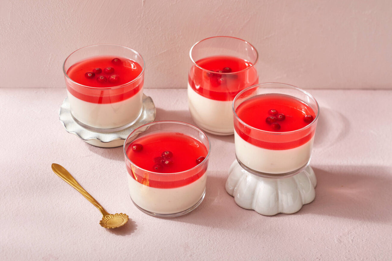 - Purista liivatelehdistä ylimääräinen vesi ja liuota liivatteet kuumaan kermaseokseen. Sekoita joukkoon puolukkakeitto.