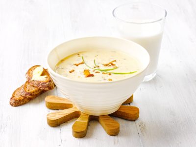 - Tarjoa peruna-purjososekeitto paahdettujen perunankuorilastujen kanssa.