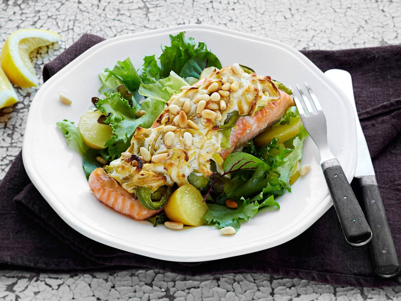 - Yhdistä purjo ja crème fraîche. Lusikoi seos kalan päälle.