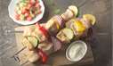 - Paloittele kurkku kannumaiseen astiaan. Lisää yrttilehdet.