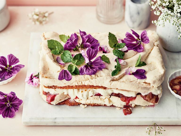 4. Puolita pohja. Levitä raparperitäyte pohjalle ja sen päälle kermavaahto. Nosta toinen pohjalevy päälle. Koristele halutessasi syötävillä kukilla.