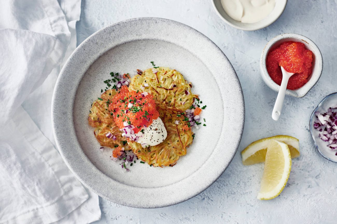 - Tarjoa röstit blinien tapaan mädin, hienonnetun sipulin ja mustapippurin kera. Viimeistele annos tuoreella yrtillä. Makua terästää pieni sitruunamehutujaus lohkosta puristettuna.