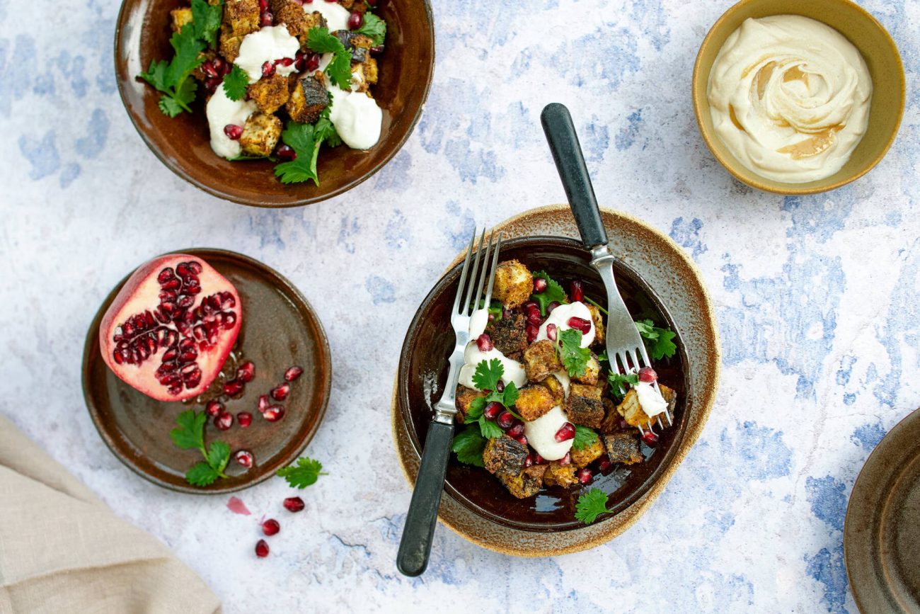 - Valmista paistamisen aikana lisukkeet: Sekoita jogurtti ja tahini tasaiseksi kastikkeeksi. Hienonna yrtti ja yhdistä se granaattiomenan siementen joukkoon.