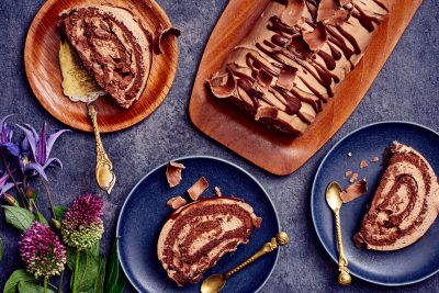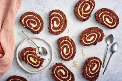 - Levitä 1/3 vaahdosta pohjalle. Leikkaa levy leveyssuunnassa kahteen osaan. Kääri kaksi rullaa pitkältä sivulta leivinpaperin avulla. Jätä saumakohta alle. Leikkaa rullat viiteen palaan.