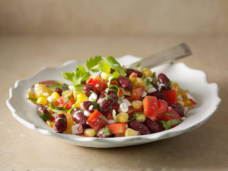 - Leikkaa paprika ja papaija tai persikka pieniksi kuutioiksi. Valuta maissi. Huuhdo säilykepavut kylmällä vedellä ja valuta.
