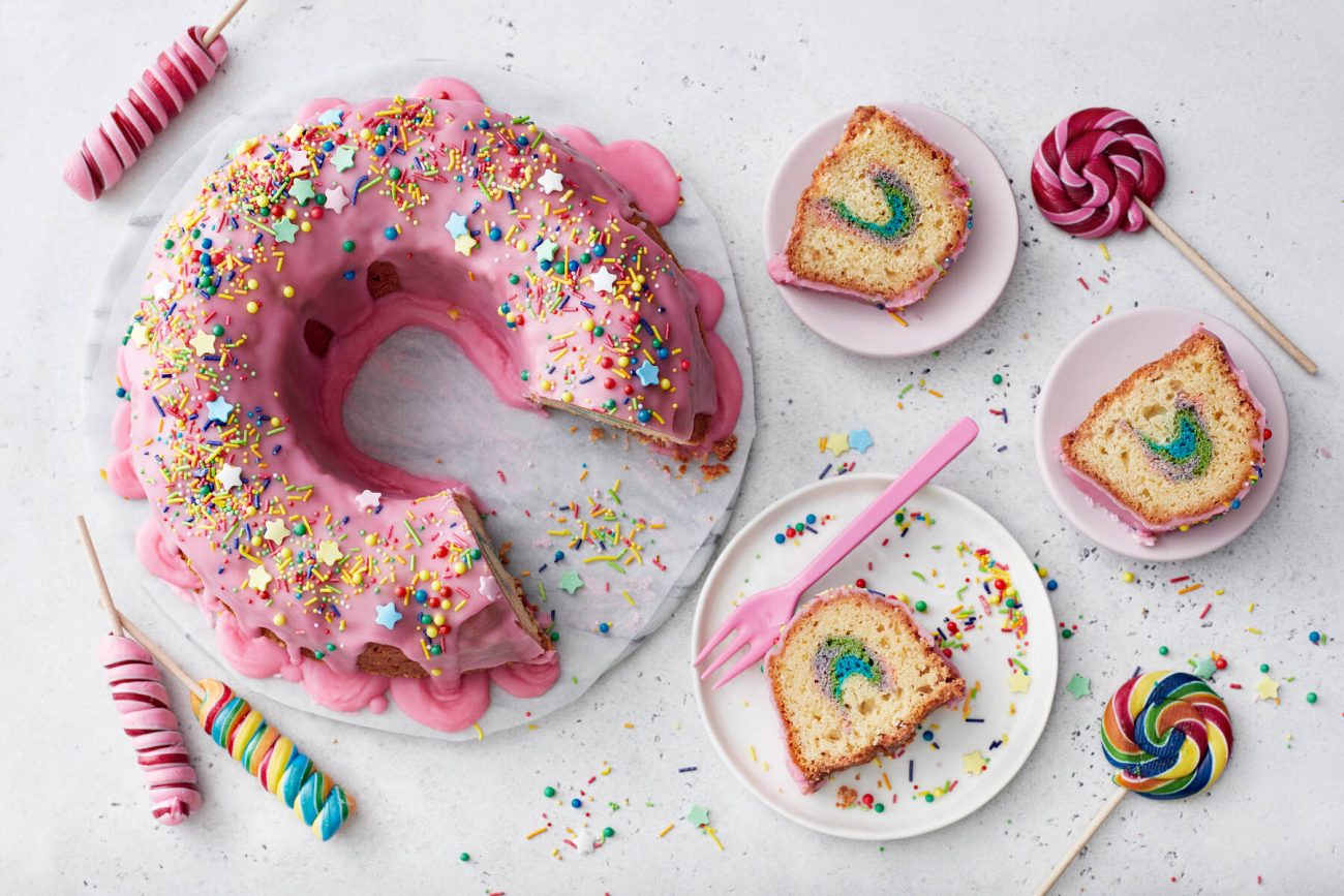 - Kaada puolet vaaleasta kakkutaikinasta vuokaan. Tee keskelle taikinaa lusikalla vuoan ympäri kiertävä syvennys. Pursota värikkäät taikinat ohuina raitoina syvennykseen päällekkäin. Lisää päälle loppu vaalea taikina ja tee jälleen keskelle vuokaa syvennys, jolloin sateenkaari kaartuu muotoonsa.