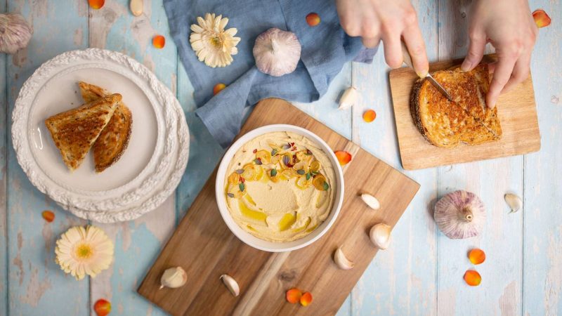 - Leikkaa leivät kahtia ja tarjoile valkosipulihummuksen kanssa.