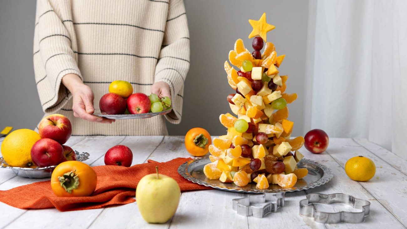 - Leikkaa lopuksi persimon- tai omenaviipaleesta piparimuotin avulla tähti ja aseta se kuusen latvaan cocktailtikun avulla.
