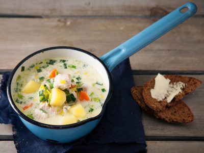 - Soseuta liemineen esim. sauvasekoittimella tai monitoimikoneessa. Lisää sulatejuusto ja kala paloiteltuna. Mausta ja kuumenna. Tarkista suola.