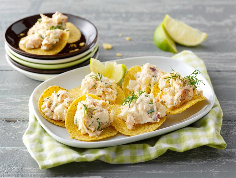 - Jaa täyte maissilastujen päälle. Koristele tillillä tai ruohosipulilla.