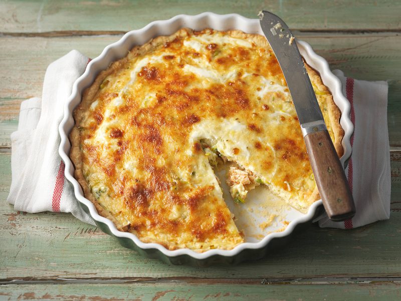 - Paista pesty ja viipaloitu purjo voissa pehmeäksi. Yhdistä täytteen ainekset ja kaada täyte pohjalle.