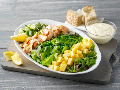 - Aseta ainekset salaattimaljaan joko ryhmittäin tai kerroksittain, raejuusto pinnalle.