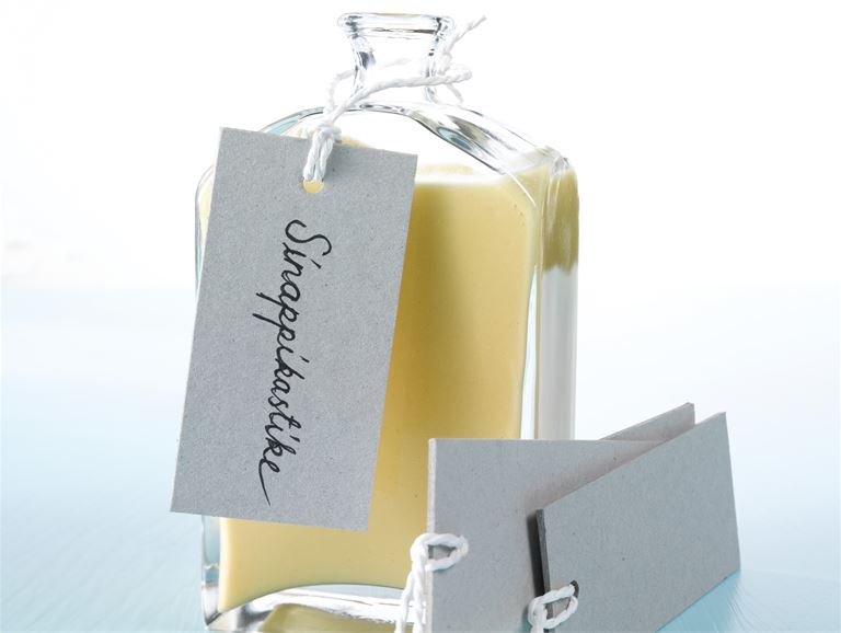 - Sekoita sinappi, sokeri ja valkoviinietikka. Lisää rypsiöljy nauhana koko ajan sähkövatkaimella sekoittaen. Lisää lopuksi mehu.