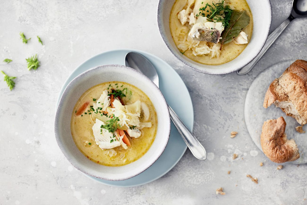 - Lisää kasvikset kattilaan, kuullota voissa. Lisää kalaliemi ja laakerinlehdet ja keitä n. 15 min, kunnes kasvikset ovat kypsiä.