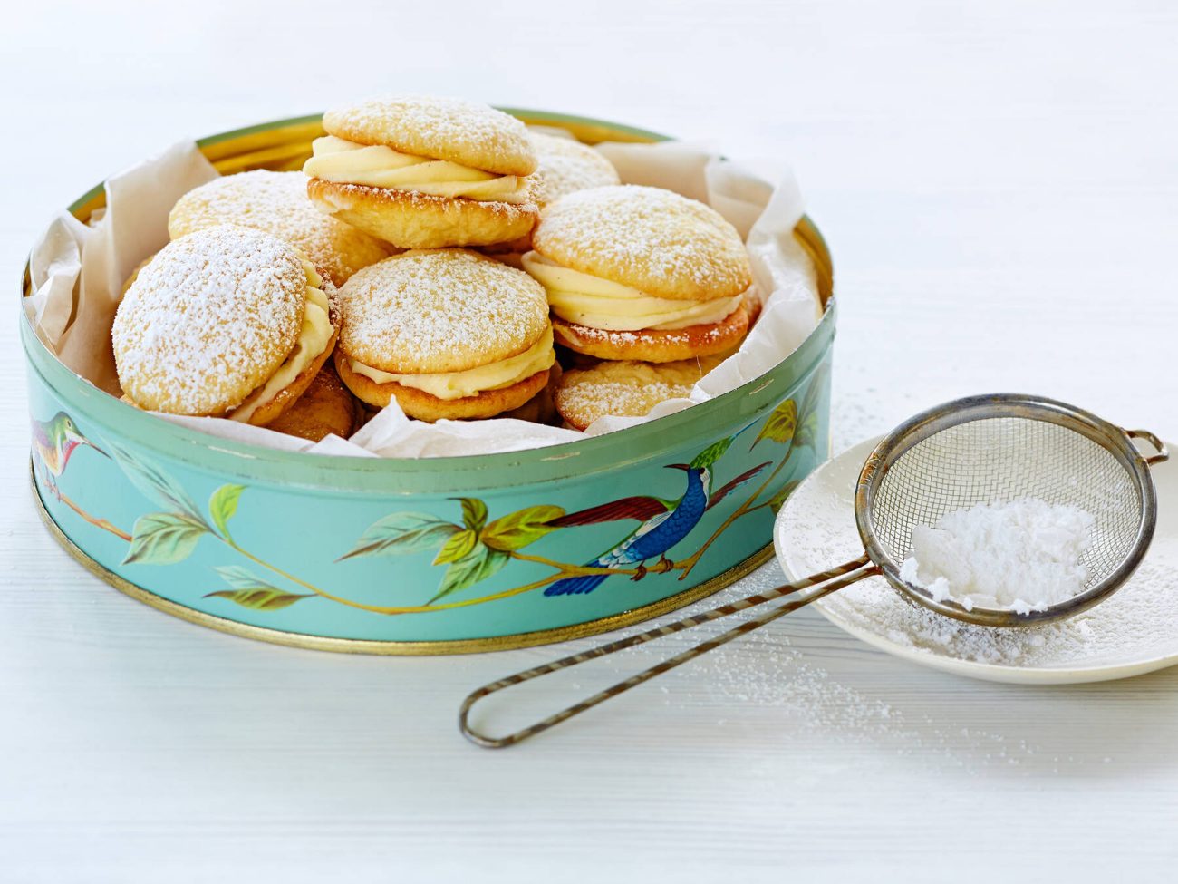 - Pursota tai levitä täyte veitsellä puolelle leivonnaispohjista, niiden sileälle pohjapinnalle. Pursota ensin kaikille pohjille niiden ulkoreunaan, niin saat täytteen jaettua tasaisesti. Sen jälkeen laita kannet.
