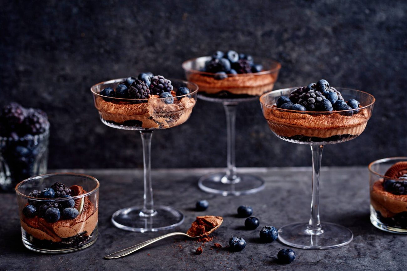 - Ripota pinnalle kaakaojauhetta. Koristele annokset kekseillä ja marjoilla.