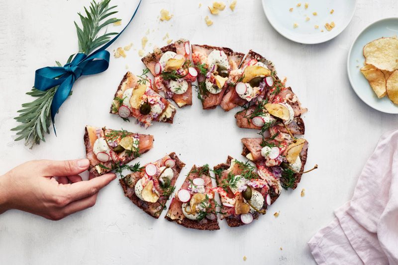 - Asettele reikäleivän puolikkaat leikkuulaudalle. Voitele pinnat voilla ja levitä päälle lohiviipaleet. Leikkaa annospaloiksi, kumpikin leipä 10 osaan.
