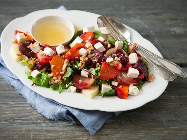 - Kuori ja paloittele kurpitsa, punajuuret ja sipulit. Laita laakeaan uunivuokaan. Valuta päälle hunaja ja Oivariini. Mausta suolalla ja pippurilla.