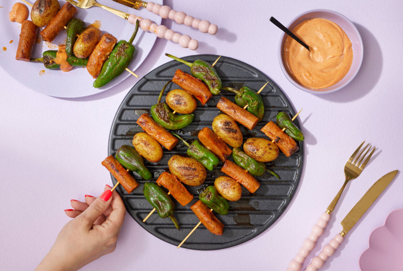 - Pujota varrastikkuihin vuorotellen nakkeja, perunaa ja paprikaa.