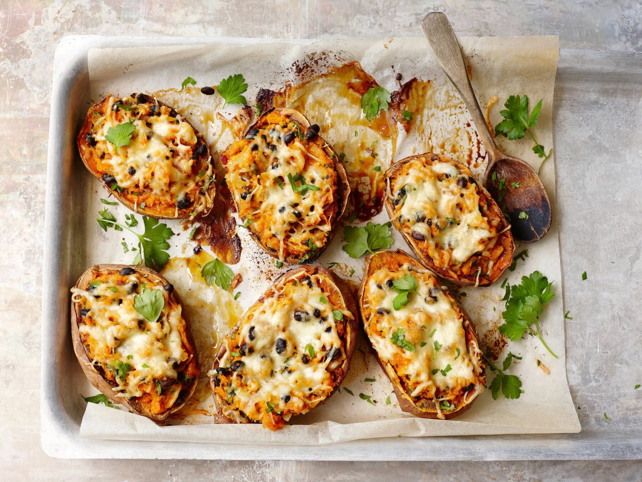 - Kun bataatit ovat kypsiä, koverra niiden sisus pekoni-sipuliseokseen, jätä kuoret uunipellille. Lisää seokseen puolet juustoraasteesta, mausteet, limemehu ja hienonnettu persilja. Sekoita.
