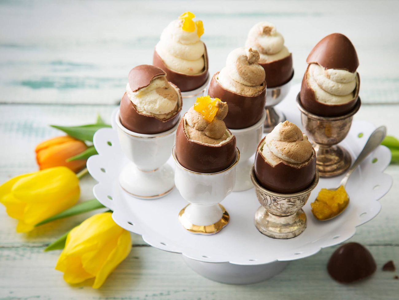 - Leikkaa munasta lakki irti, poista yllätys. Laita suklaamuna munakuppiin. Pursota täyte munan sisään. Nosta lakki päälle. Jos lakki on murentunut, ripottele suklaamurut täytteen pinnalle.