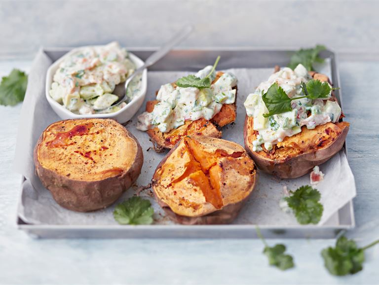 - Lusikoi täyte bataattien päälle. Nauti heti.