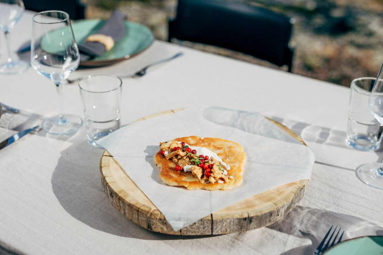 - Tarjoile leivät crème fraîchen, puolukoiden, voissa paistettujen sienien sekä tuoreen timjamin kanssa.