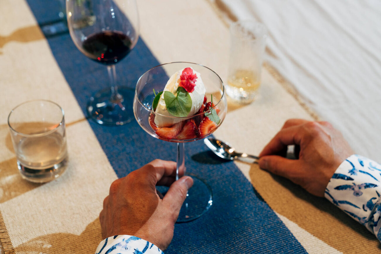 - Kokoa annos. Nosta lusikalla tarjoilukulhoon seljankukkasokeriliemellä maustettuja mansikoita ja päälle mascarponevaahtoa.