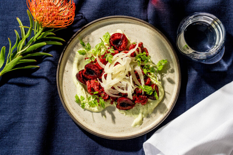 Klassinen tartar saa kesäistä makua raikkaasta fenkolista ja makeista kirsikoista. Makuelämyksen kruunaa aromaattinen lipstikkatuorejuusto.