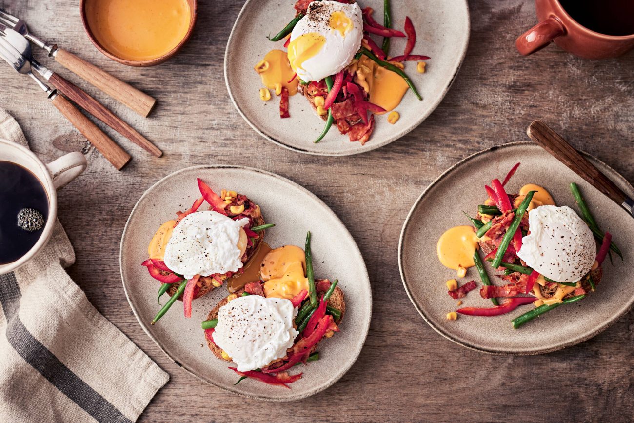 - Leikkaa paprika ohuiksi suikaleiksi. Levitä Koskenlaskijaa uunissa paahtuneille leiville ja annostele päälle chorizo-papupaistosta sekä tuoreita paprikasuikaleita. Asettele päälle uppomuna ja rouhi pinnalle mustapippuria.