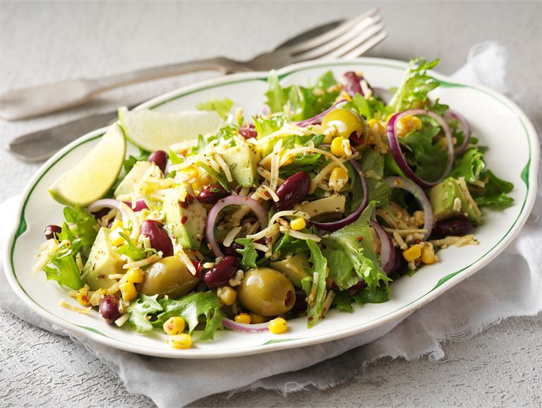 - Paloittele avokado. Laita avokado, pavut, ananas/maissi, punasipuli ja oliivit kulhoon. Valuta päälle sitrusmehu ja öljy.