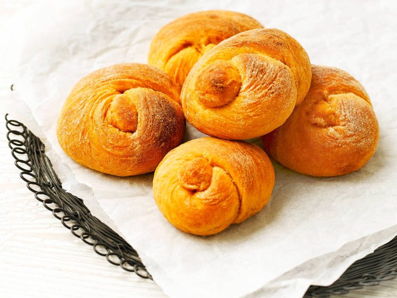 - Leikkaa tanko 14:ään osaan. Pyöräytä ne solmuiksi. Laita leivinpaperille pellille. Kohota sämpylät.