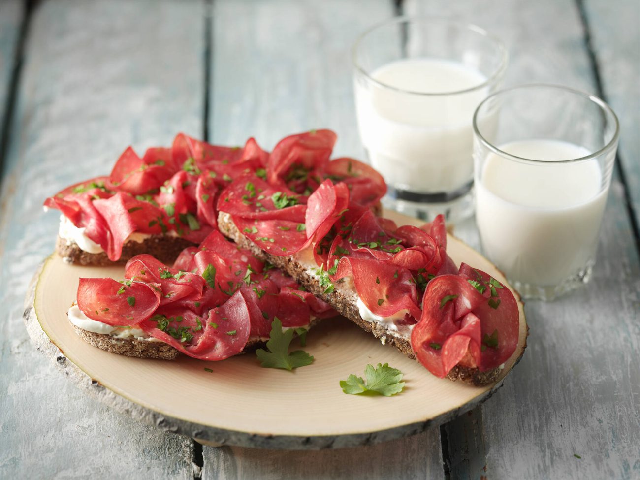 - Lisää päälle ohuita kylmäsavuhärkäviipaleita ruusukkeina tai rullina.