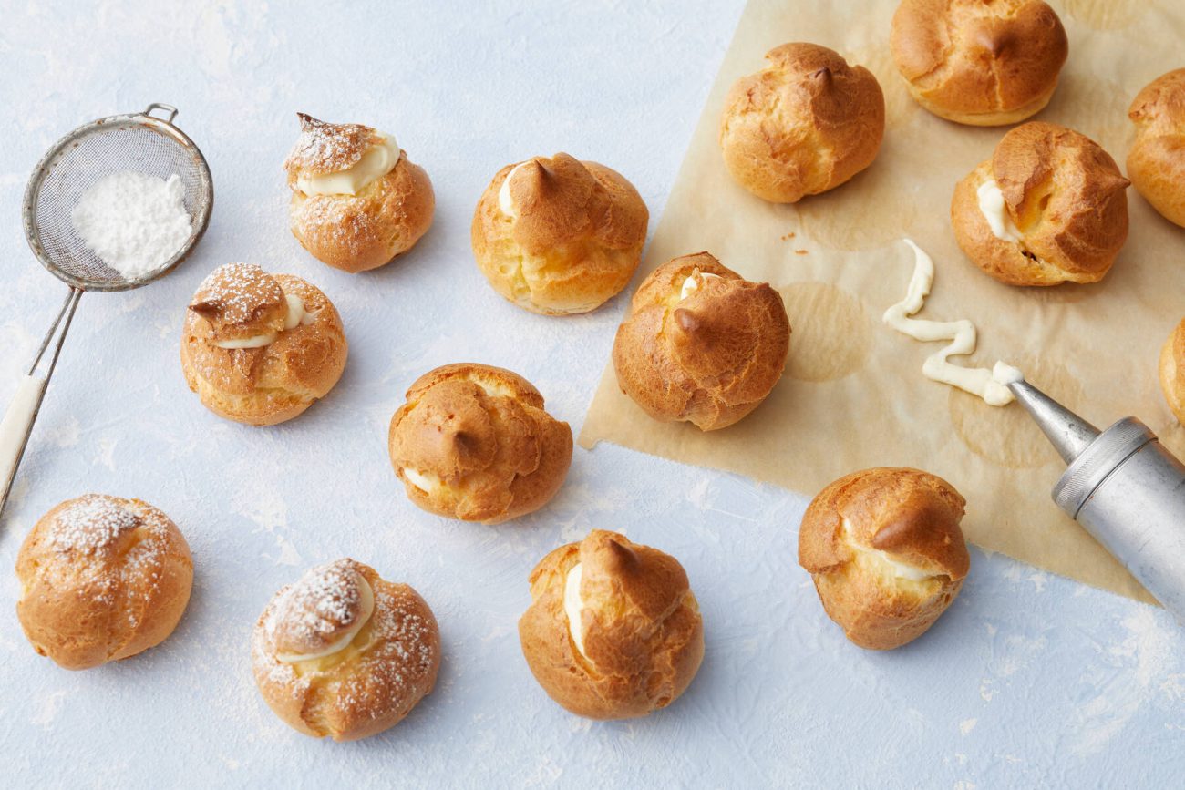 - Halkaise pohjat. Pursota tai lusikoi vaniljatäytettä tuulihattujen sisään.