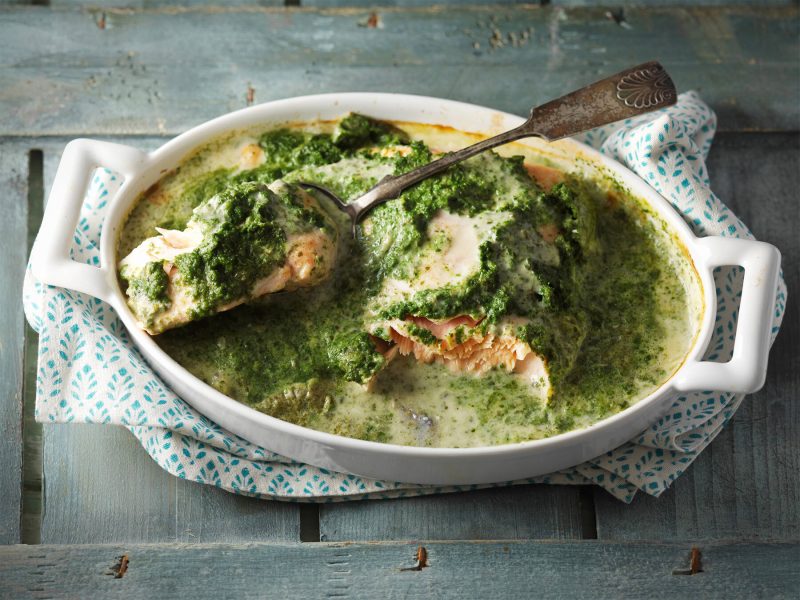 - Kuumenna kerma ja pinaatti kattilassa. Kaada pinaattikastike vuokaan kalapalojen päälle.
