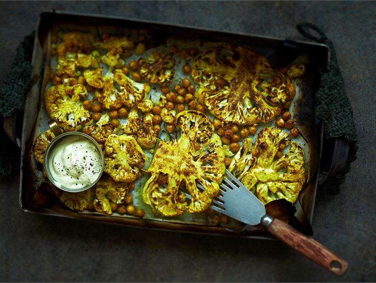 - Leikkaa kukkakaali ohuehkoiksi viipaleiksi. Asettele leivinpaperoidulle uunipellille. Valuta kikherneet, lisää pellille.