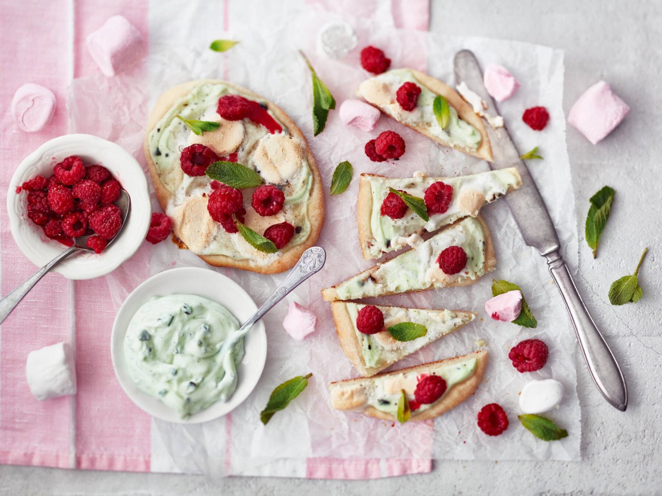 - Sekoita rahkan joukkoon rouhittu suklaa. Levitä rahka pizzapohjille. Ripottele päälle paloitellut vaahtokarkit ja perunajauhoissa pyöräytetyt pakastevadelmat. Jos käytät tuoreita vadelmia, lisää ne pizzaan paistamisen jälkeen.