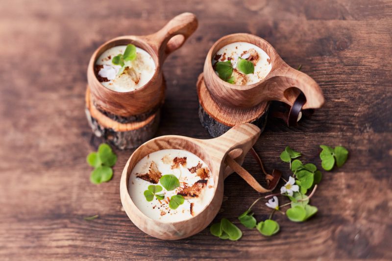- Jaa leipäviipaleet neljään kuksaan tai kuppiin ja kaada kuuma juustoliemi päälle.