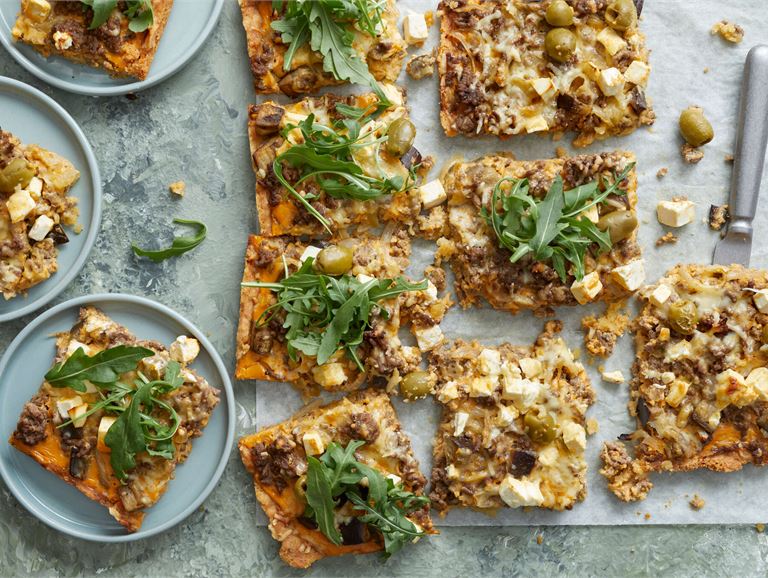 - Hienonna sipulit ja kuutioi munakoiso. Kuullota pannulla voissa. Lisää jauheliha ja paista kypsäksi. Mausta. Levitä seos pellille taikinalevyn päälle. Lisää pinnalle oliivit ja valutetut salaattijuustokuutiot.