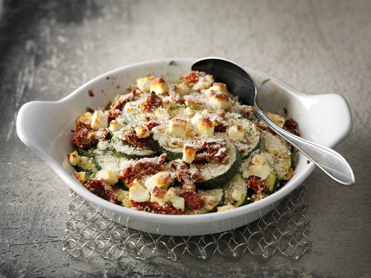 - Lado kasvikset voideltuun uunivuokaan. Ripottele pinnalle oreganoa, suikaloitua aurinkokuivattua tomaattia, murusteltua salaattijuustoa sekä lopuksi korppujauhoja.