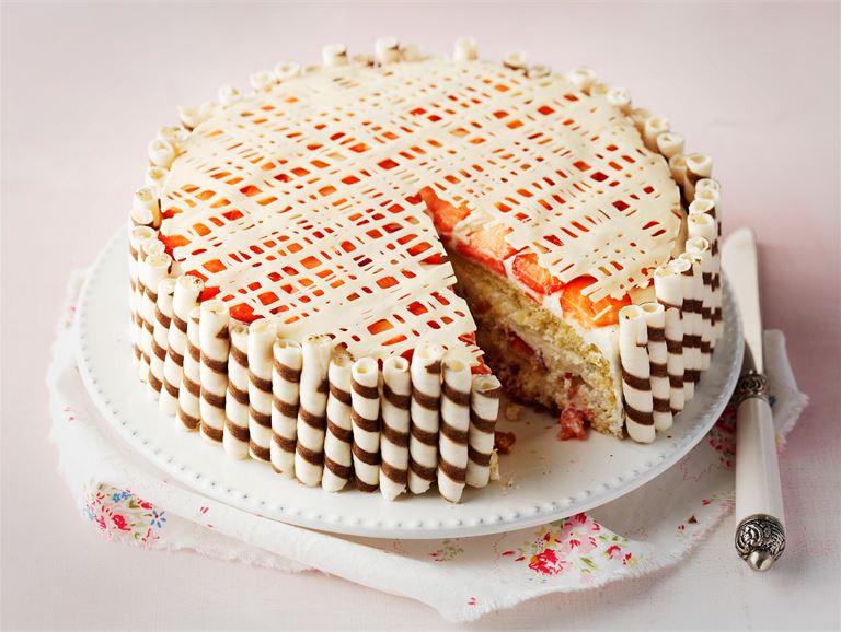 - Viipaloi mansikat ja laita niitä kostutetulle pohjalle. Lisää puolet valkosuklaa-kermavaahdosta. Kostuta ja täytä toinen väli samaan tapaan. Peitä kakku kuvulla ja nosta kylmään. Anna makujen tasoittua 5 - 6 tuntia tai yön yli