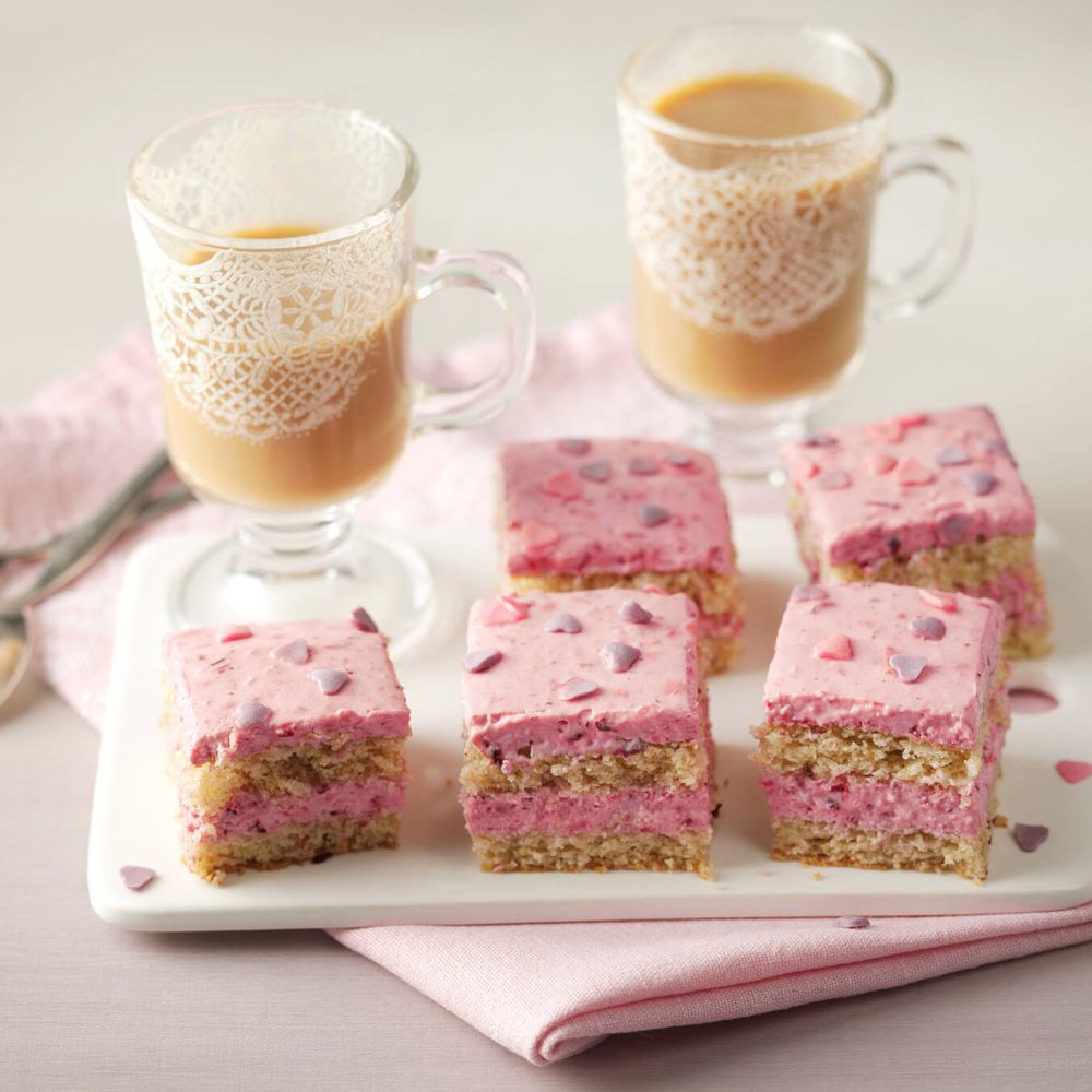 - Kostuta alin kakkulevy kolmanneksella maitoa. Levitä levylle puolet puolukka- ja valkosuklaatäytteestä.