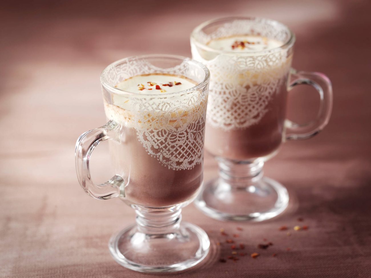 - Kaada kaakao mukeihin tai kuuman kestäviin laseihin. Lisää päälle pehmeä vaniljavaahto. Lisää laseihin lusikat. Ripota pinnalle chiliä halutessasi