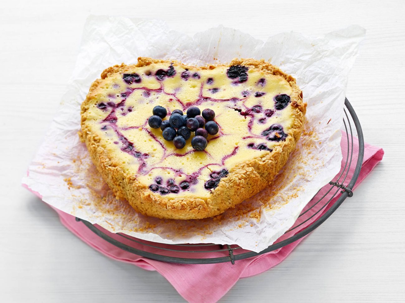 - Lusikoi mustikkamehu tortun pinnalle kahdeksi sisäkkäiseksi ympyräksi (tai sydämeksi, jos käytät sydänvuokaa). Vedä veitsellä keskikohdasta reunoihin päin 4 - 5 viiltoa. Näin syntyy koristekuvio.