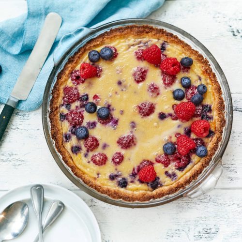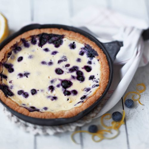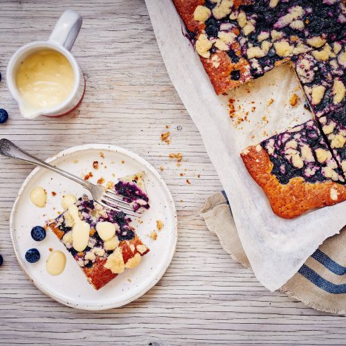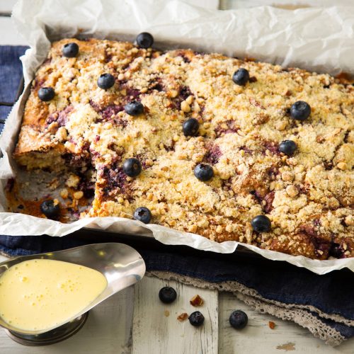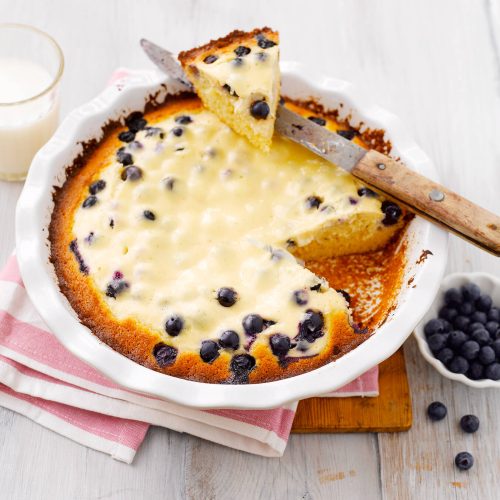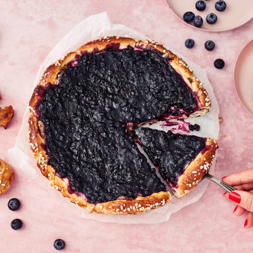 - Vatkaa tuorejuuston joukkoon muna ja sokeri. Kaada mustikoiden päälle.