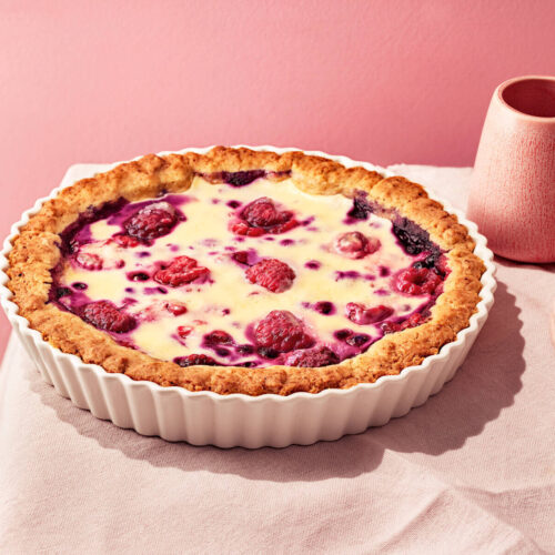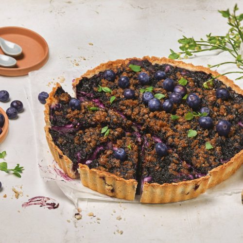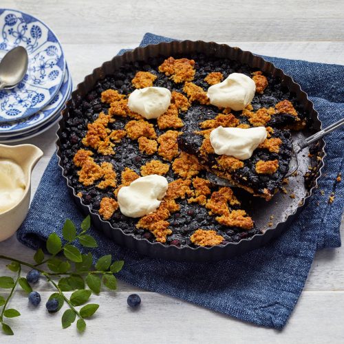 - Jos käytät pakastemustikoita, sekoita niihin ensin perunajauhot. Kaada mustikat vuoan pohjalle, reunoille enemmän kuin keskelle.