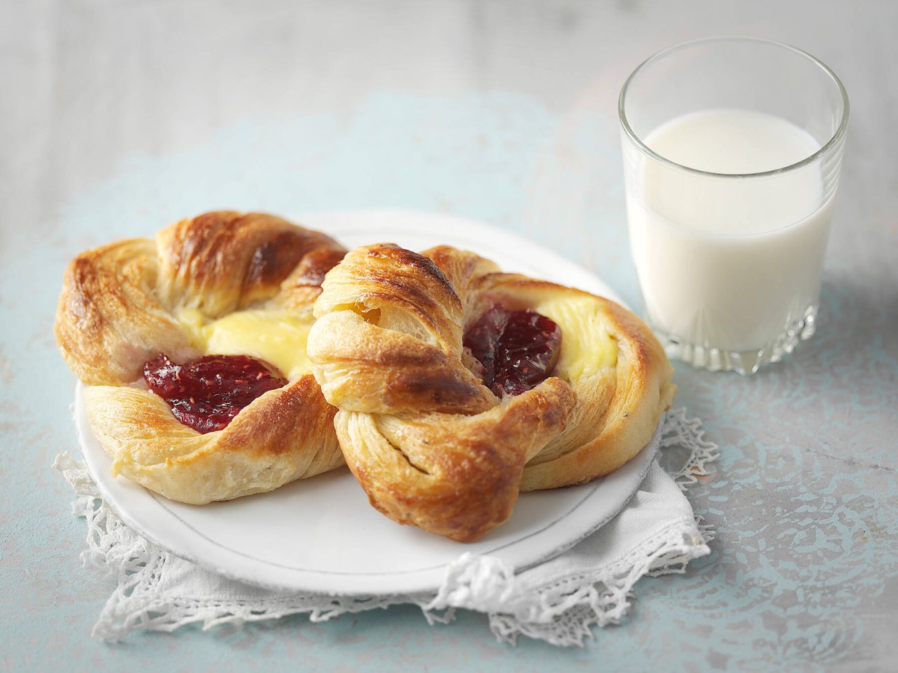 - Voitele kohonneet wienerit "huolimattomasti" munalla. Lisää päälle n. 1 rkl vaniljakiisseliä ja toiseen päähän n. 2 tl marmeladia.