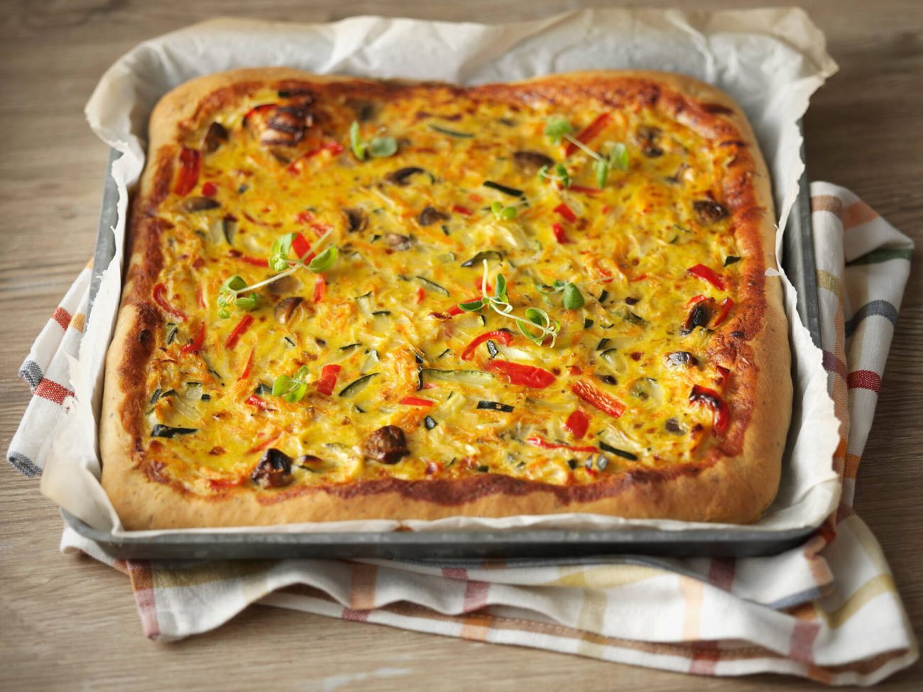 - Sekoita joukkoon munat ja mausteet. Levitä kasvisseos kohonneelle pohjalle ja paista 250 asteessa n. 15 - 20 min. Leikkaa hieman jäähtyneenä paloiksi.