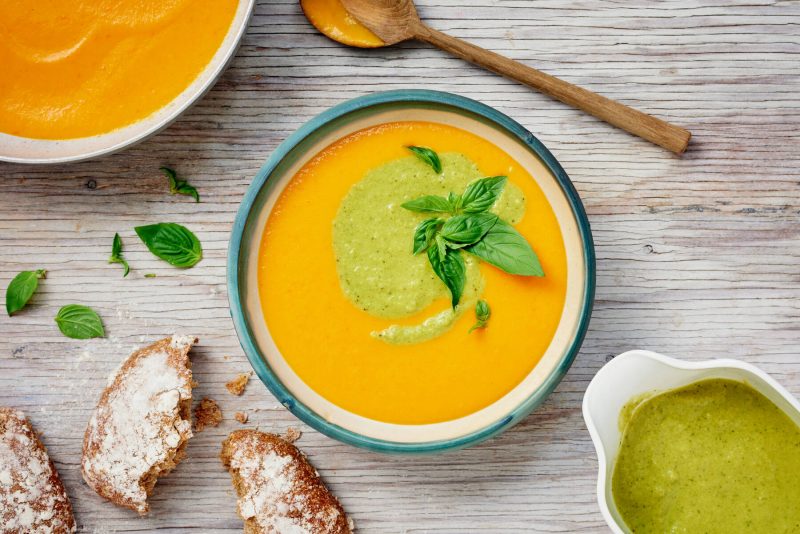 - Lisää paprika-peruna-porkkanakeittopohjaan appelsiinimehu ja 1 rkl fondia. Soseuta.